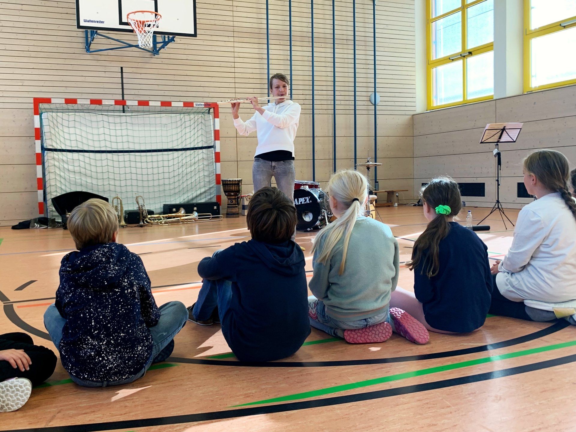 ... all das braucht man, wenn man Musik macht. Die Schülerinnen und Schüler der Grundschule Kirchheim durften all dies in der letzten Septemberwoche in der Turnhalle unter Beweis stellen, als Melanie Hafner, Michael Werner und Harald Schuster des Blasorchesters Kirchheim die verschiedenen Instrumente vorstellten.
