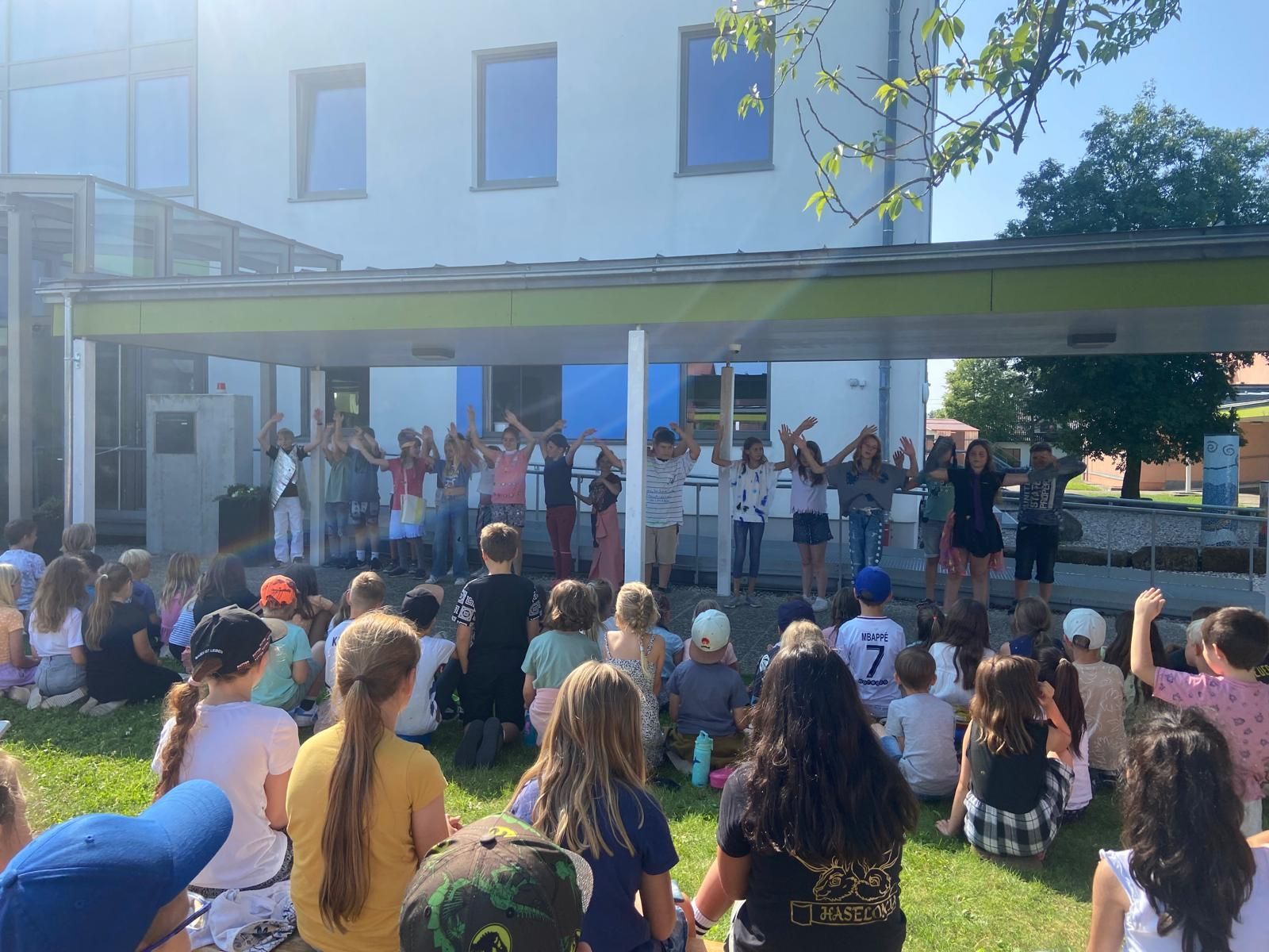 Bevor Herr Ott die Kinder und Eltern der Schulfamilie verabschiedete, zeigten die Kinder der 4. Klasse unter der Leitung von Frau Winkler einen Cupsong und veranschaulichten mit dem Lied „Ihr geht jetzt zur Schule“, was man neben lesen und rechnen auch noch in der Schule lernt.